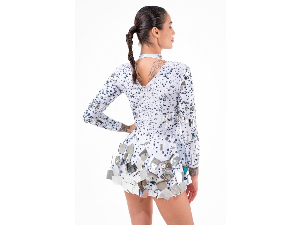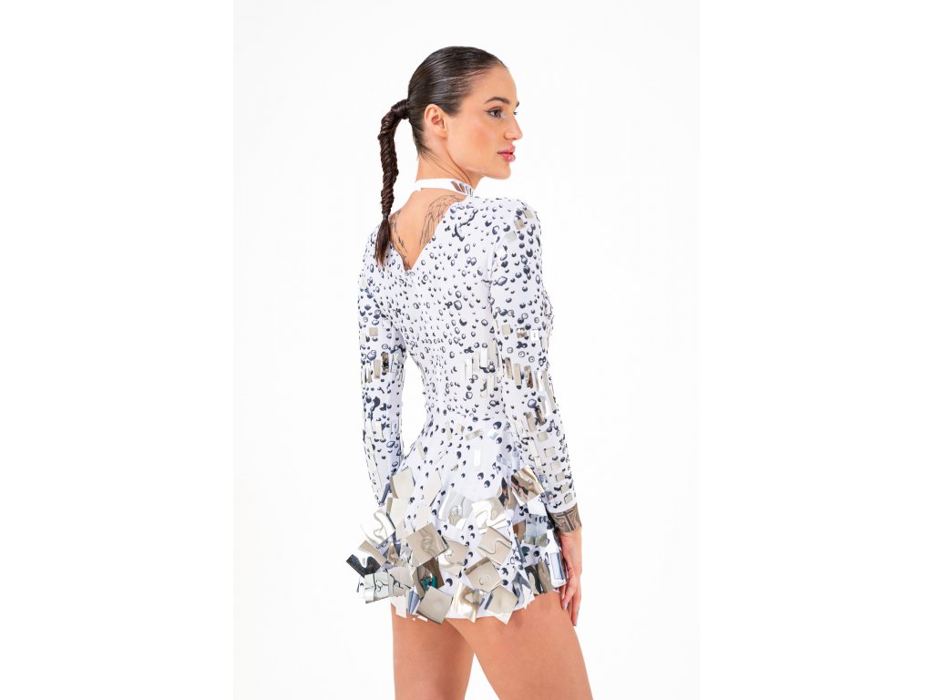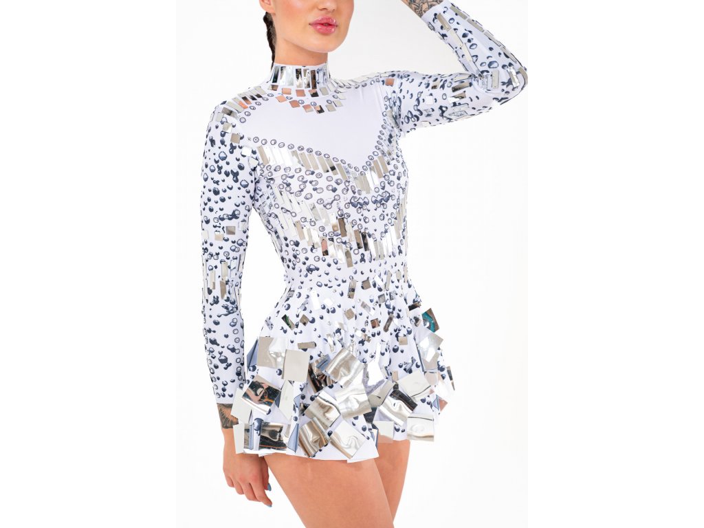 Das Minikleid Mirror ist von der Discokugel inspiriert. Handgenähte Pailletten und Perlen lassen Sie bei jeder Bewegung glänzen und sorgen dafür, dass Sie sich von der Masse abheben.