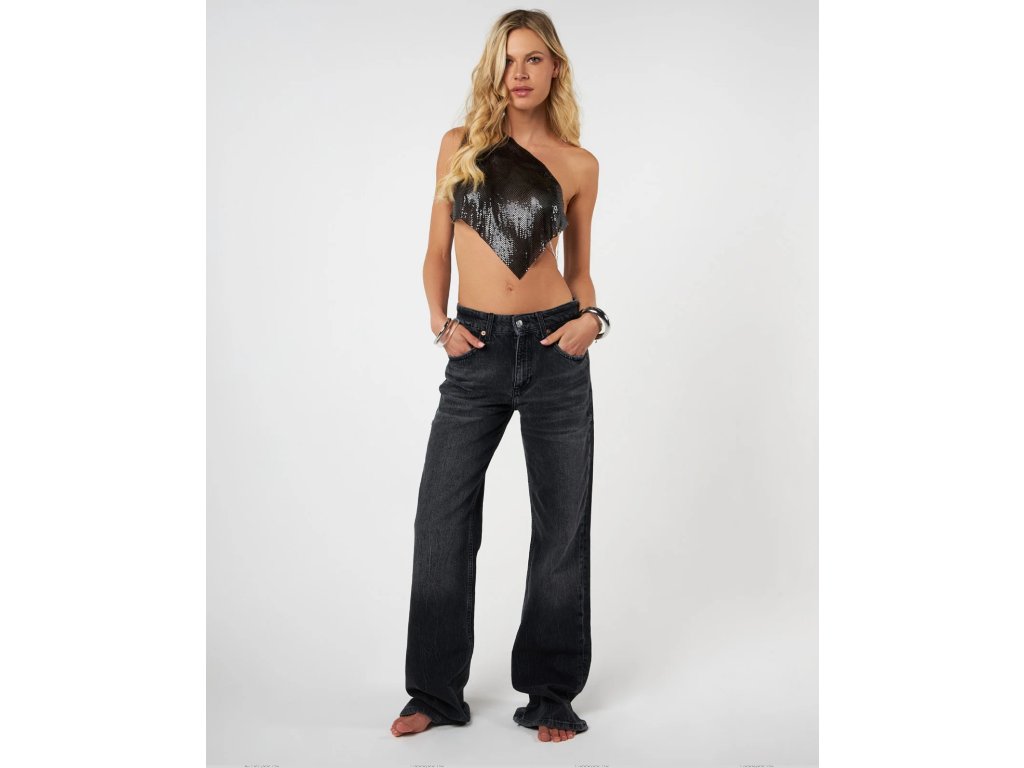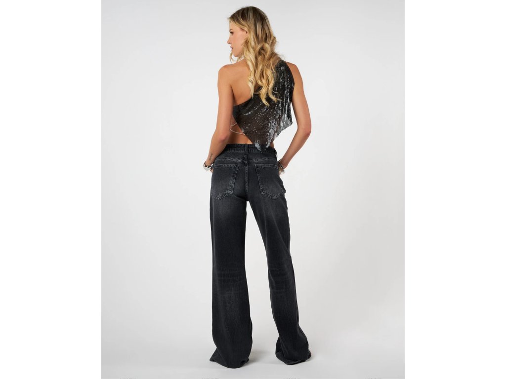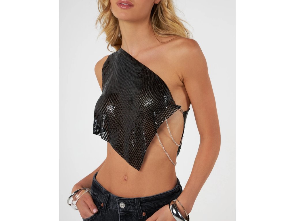 Schwarzes Metall-Top mit einer Schulter und feinen Kettchen. Minimalistisches Stück mit Ausdruck.