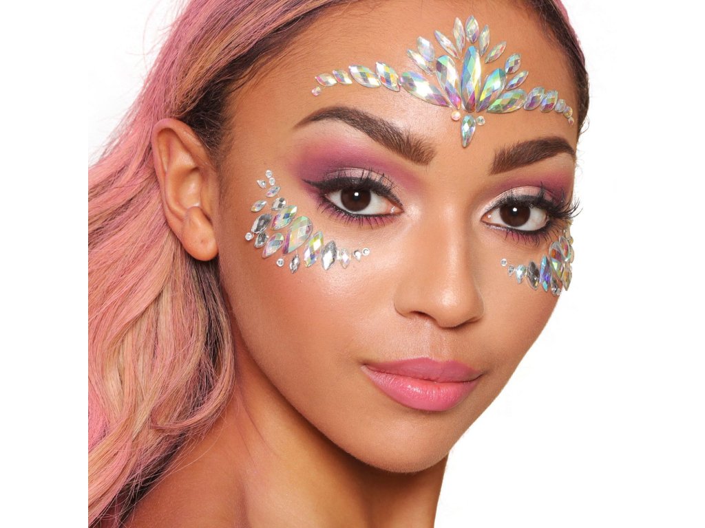 Selbstklebende Strasssteine im Gesicht sind das perfekte Accessoire für eine Party oder ein Festival.