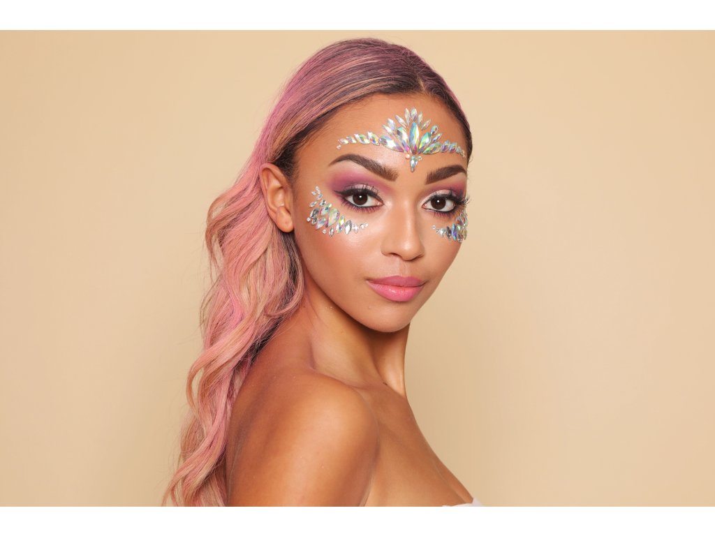Selbstklebende Strasssteine im Gesicht sind das perfekte Accessoire für eine Party oder ein Festival.